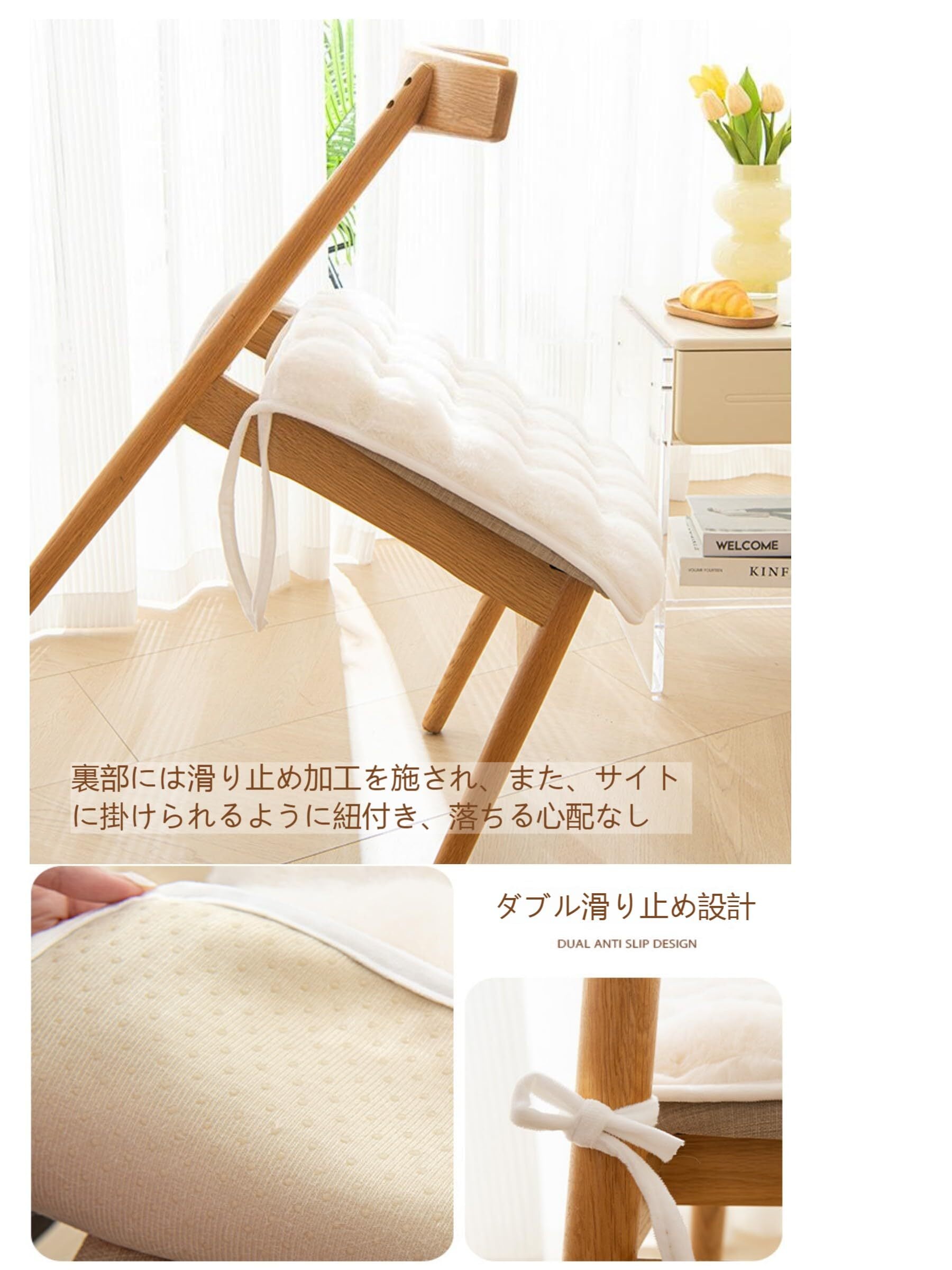 【滑り止め機能】に特別な滑り止め加工が施されており、椅子やソファーの上で安定して使用することができます。さらに、便利な紐付きデザインにより、必要に応じてしっかりと固定することが可能です。移動や振動のある場所でも安心して使用できます